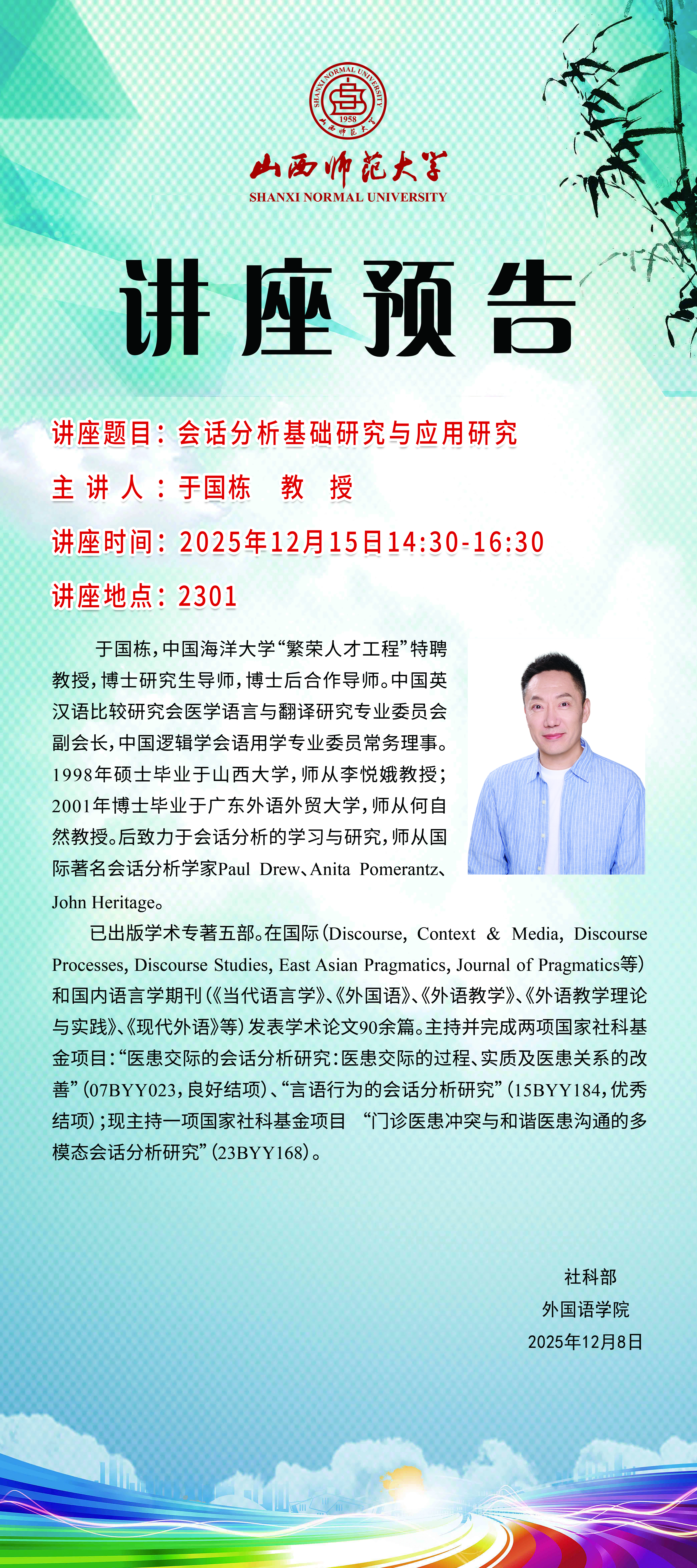 【预告】中国海洋大学于国栋教授应外国语学院邀请作学术报告
