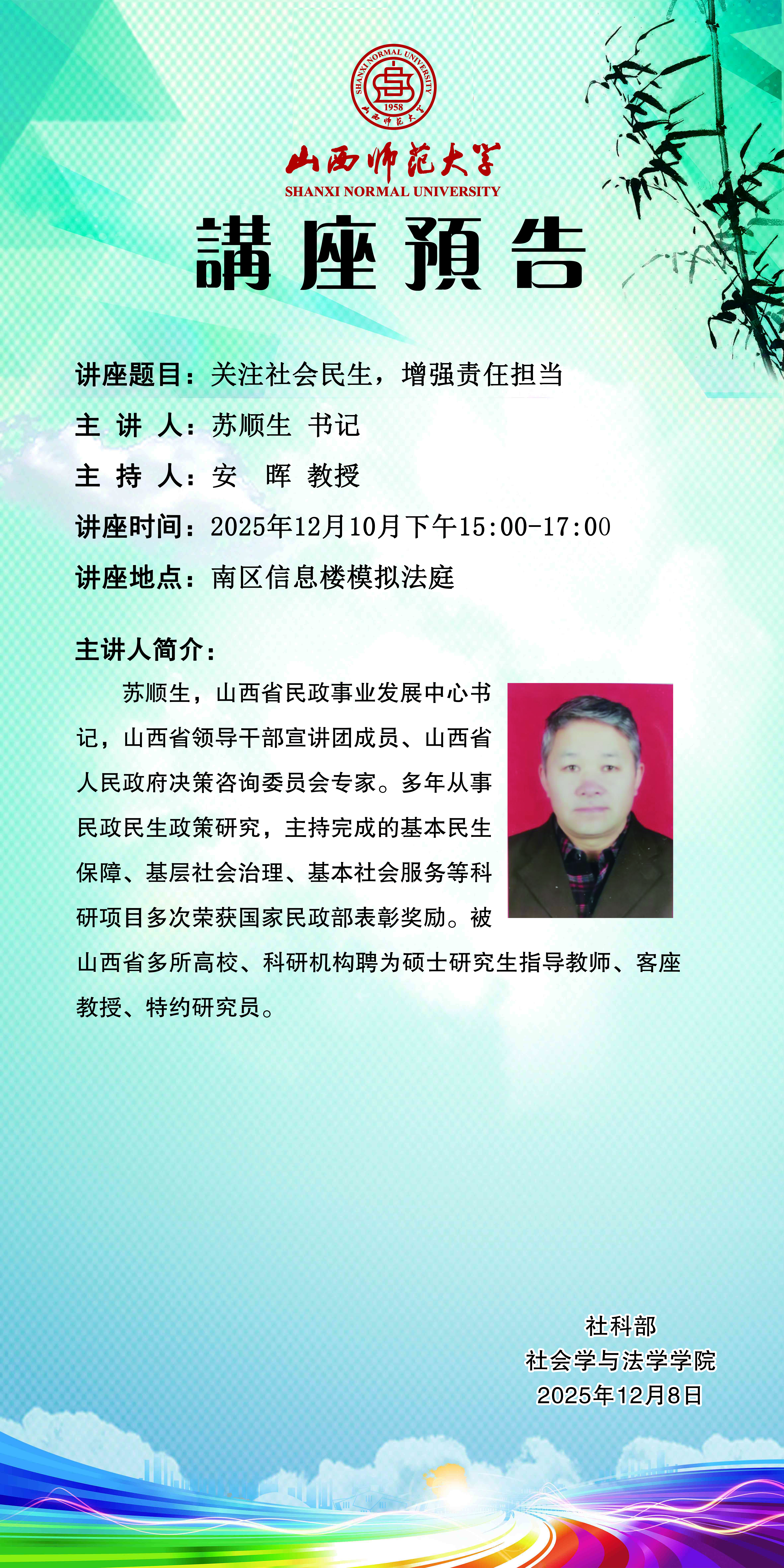 【预告】山西省民政事业发展中心书记苏顺生应社会学与法学学院邀请作学术报告