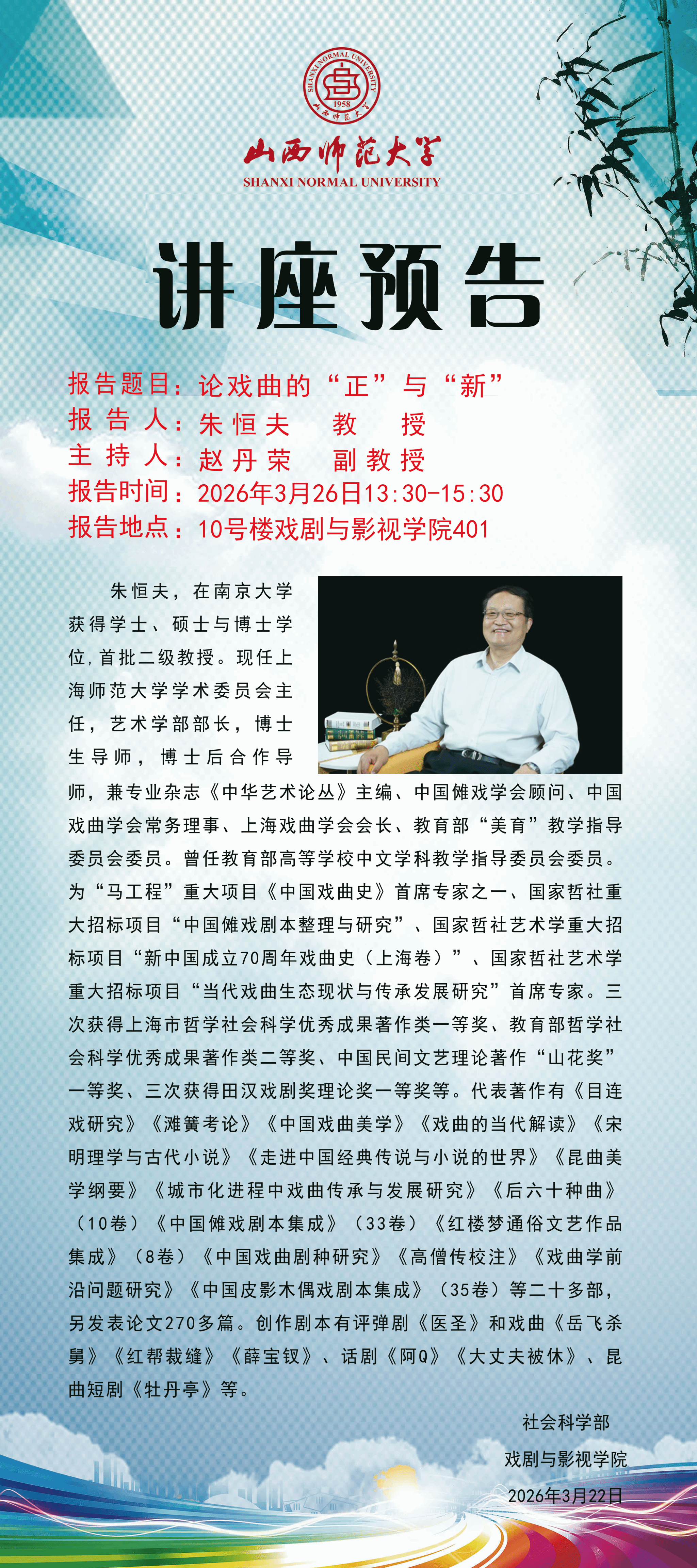 【预告】南京大学学术委员会主任朱恒夫教授应戏剧与影视学院邀请作学术报告